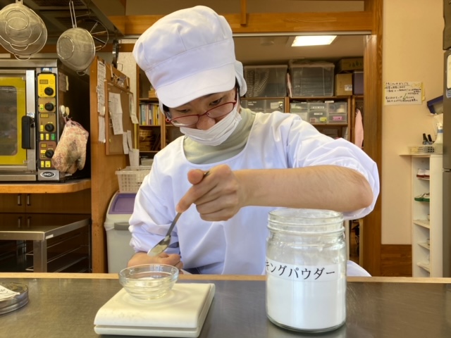 お菓子づくりで一番難しいのは、計量です。お砂糖や小麦粉を慎重に量りで量っています。そう言いながら、こぼしちゃうことも結構あるんですけどね(笑)。でも、こすもす班の皆はやさしくて、私が失敗してしまった時も「大丈夫だよ~」と声をかけてくれます。仕事の間は、黙々と集中してつくっていますが、雰囲気が良いです。