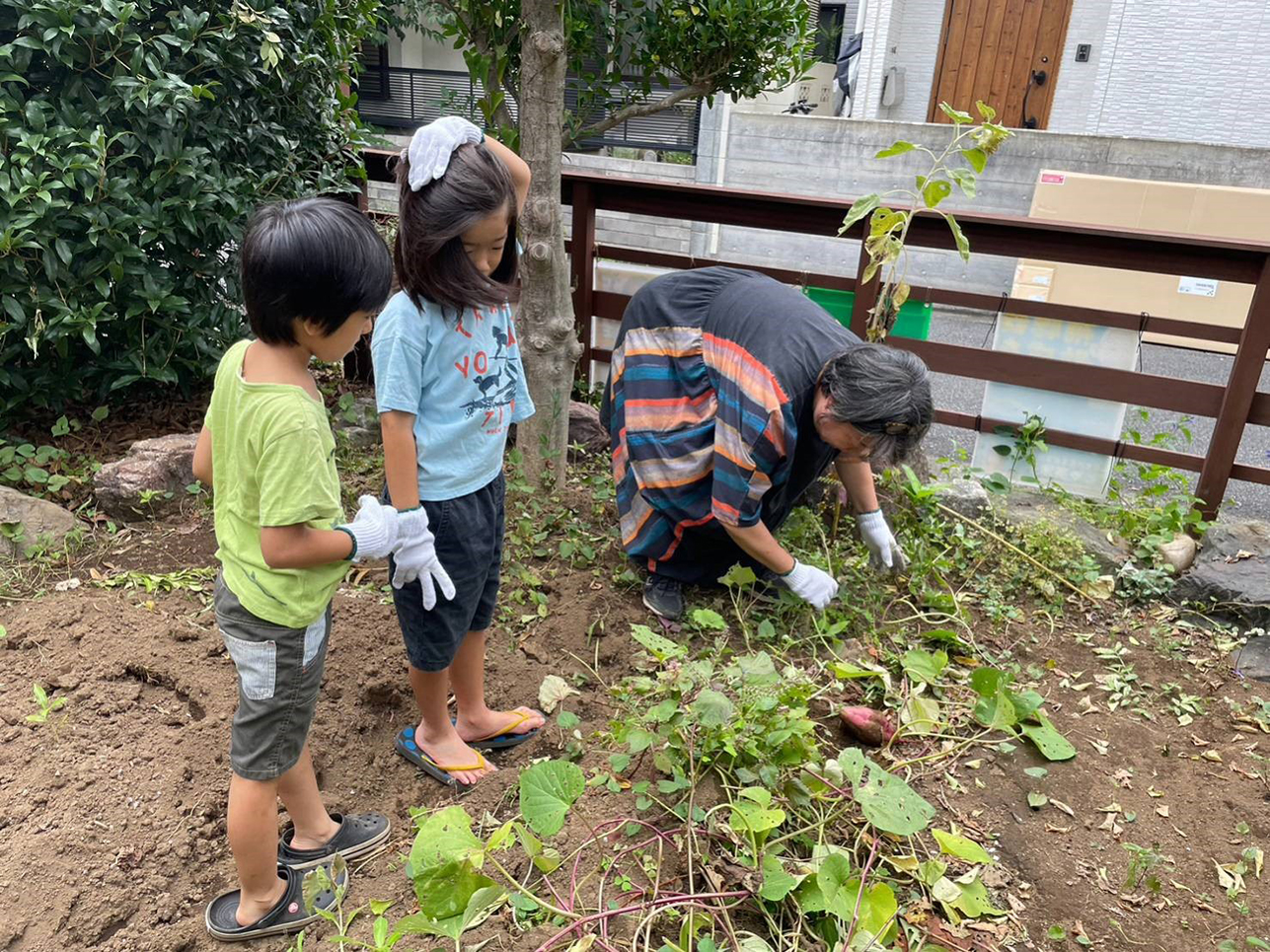 畑で芋掘りの仕方を教わる子どもたち
