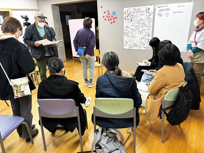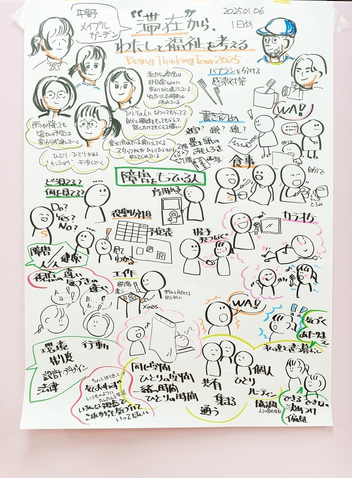 今回の取組みは、高校生に自分自身と重ねて、福祉や地域について考えてもらうことが目的であるとともに、その様子を福祉関係者や教育関係者へ伝え、取組みが広がることも意図しています。2日間のツアーの様子は写真や映像でさまざまなプロジェクトを記録するアーティストの冨田了平さんに映像制作を依頼し、また、対話の時間のグラフィックレコーディングを民生児童委員でもある齋藤みささんにお願いしました。今後、映像(※2)や冊子等のアウトプットを介して、福祉施設での“滞在”が参加者や施設にもたらす作用や、参加者・関係者の声を共有していきながら、より多くの施設や地域で取り組んでいくことができるようなアプローチを次年度以降すすめていきたいと考えています。