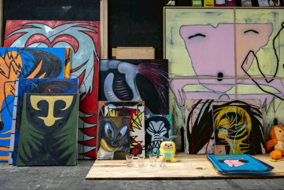 頃私たちが意識しないで通り過ぎてしまうキャラクターたちにスポットライトを当てて、作品づくりのベースにしています。例えば、アジアの商店街でひっそりと売っているおもちゃやお店のマスコットキャラクター、なんとなく顔に見える道路のシミなどです。私自身、こういうものに関心を抱いて絵を描いていくことが好きですし、そこから新しい発見もあります。不穏な空気をまといつつもユーモアにあふれたキャラクターたちを、作品を見てくれた方々にとっての味方のような、友達のような、あるいは自分自身のように感じてくれたら嬉しいです。そして、自分の作品を通じて「誰もが“ただそこにいる”だけで価値がある」というメッセージも受け取ってもらえたら。意識しないと通り過ぎて気づかれないようなキャラクターたちは、社会でそれぞれに生きる私たち自身や各々の感情に通ずるものがあるな、と感じる時があります。